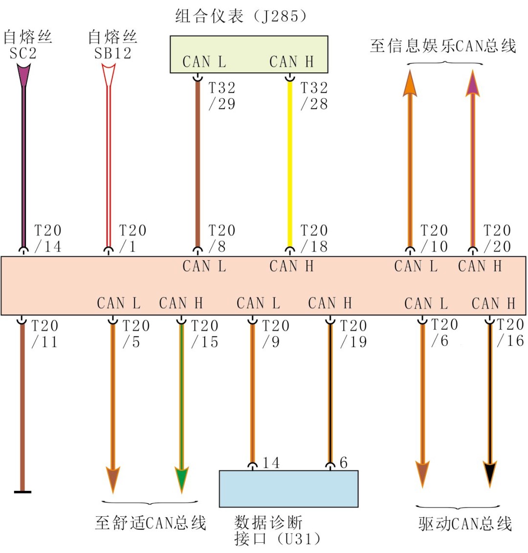 查閱電路圖後得知,閘道器(J533)共有五組 CAN 匯流排,分別為驅動 CAN、舒適 CAN、資訊娛樂 CAN、診斷 CAN,以及儀表板 CAN。