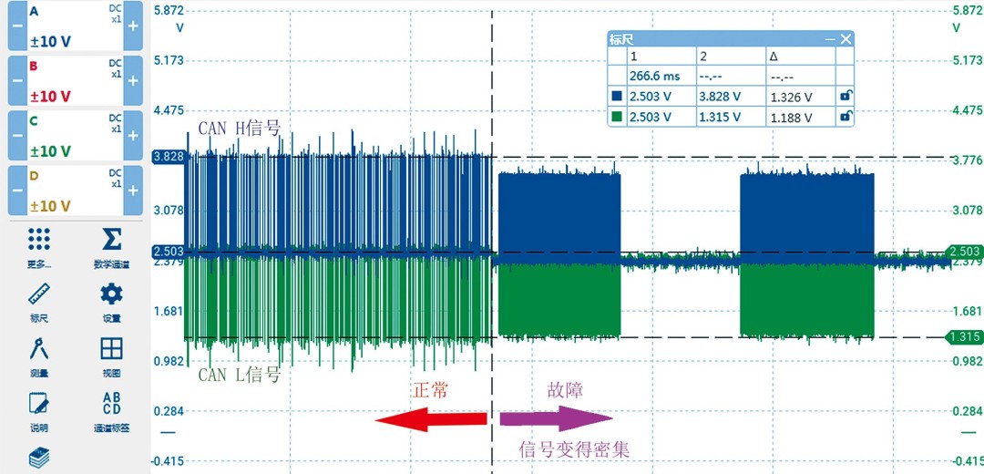 圖3 組合儀表CAN匯流排的訊號波形變得密集