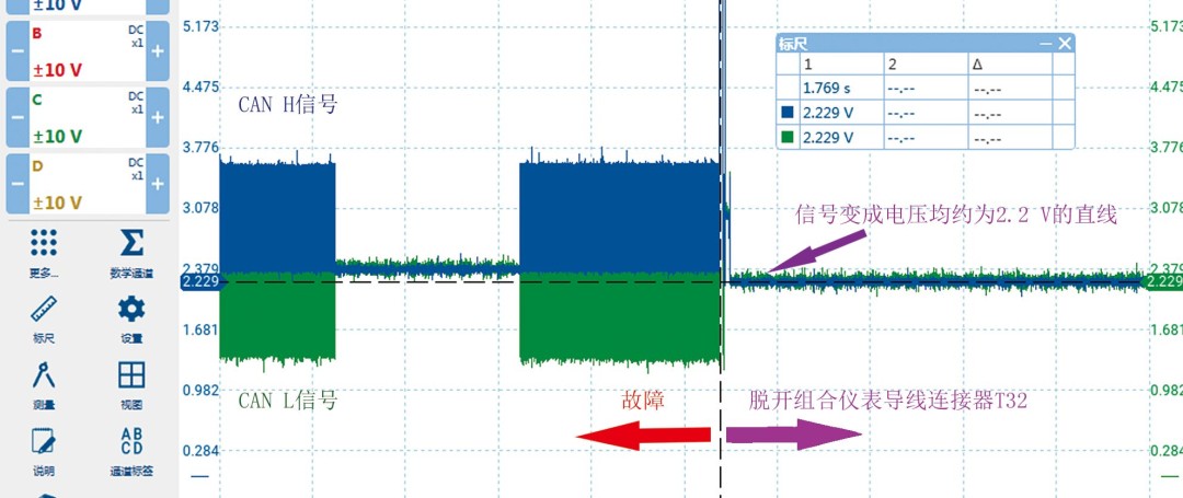 圖4 通組合儀表CAN匯流排的訊號波形變成2條直線