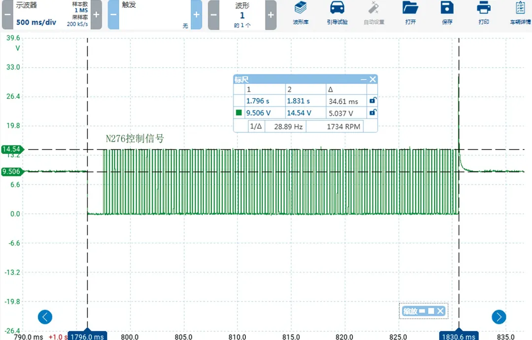 進一步放大觀察 N276 控制訊號(圖 3),可發現其電壓變化異常,控制訊號先由 9.5 V 降至 0 V,隨後再上升至 14.5 V,顯示供電狀態並不穩定。