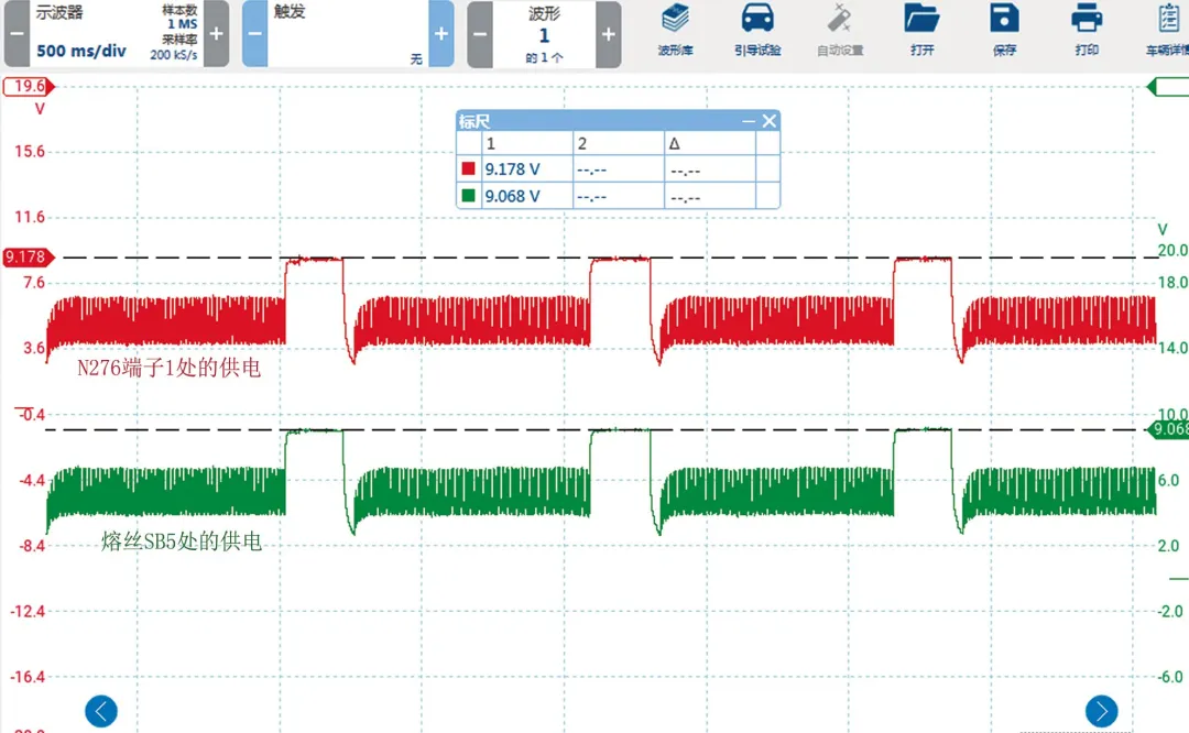 圖6 於N276端子1與熔絲SB5處量測之供電波形