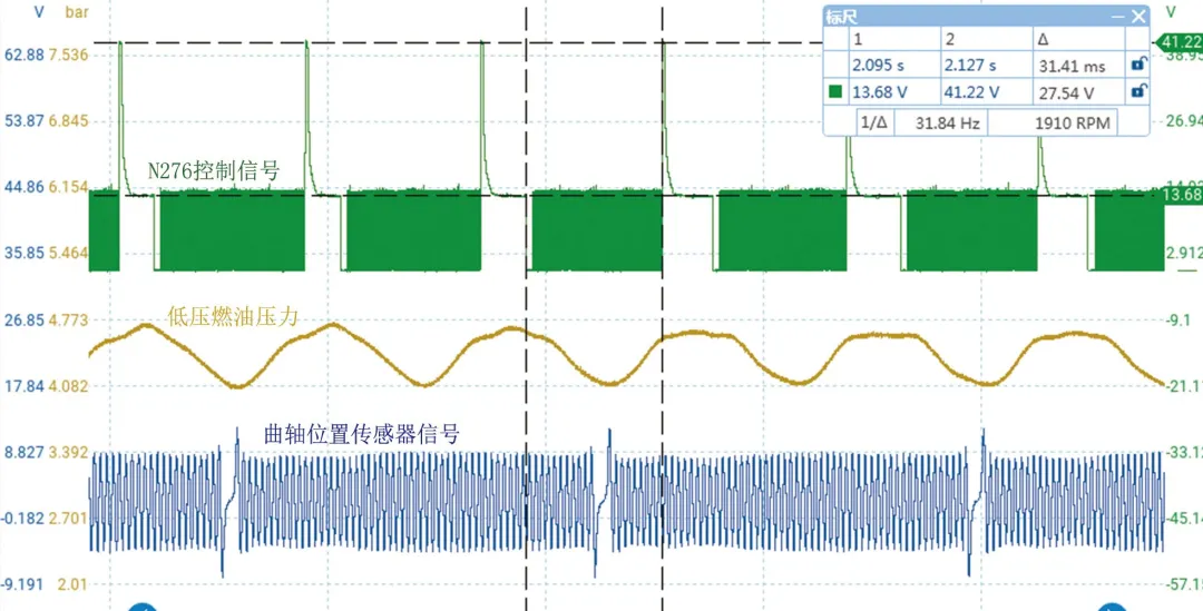 在正常情況下,N276 的控制線路僅會出現兩種電壓狀態:當 J623 提供搭鐵訊號時,端子電壓為蓄電池電壓;當未提供搭鐵訊號時,電壓應為 0 V。然而,本案例中 N276 的供電狀態異常,導致其作動不良,使高壓油泵輸出的燃油壓力異常升高。