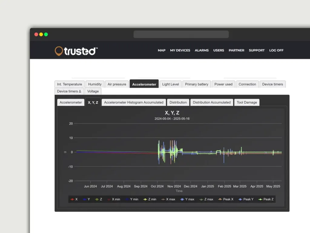 透過 Trusted 平台,企業可即時查看設備在運輸過程中的加速度數據、衝擊事件與環境變化,並以圖形化方式呈現 X、Y、Z 三軸加速度數據,協助工程與物流管理人員快速判斷設備是否受到異常衝擊。當系統偵測到超過預設門檻的衝擊事件時,平台可發送即時警示,協助企業及早發現潛在問題,降低設備損壞風險。