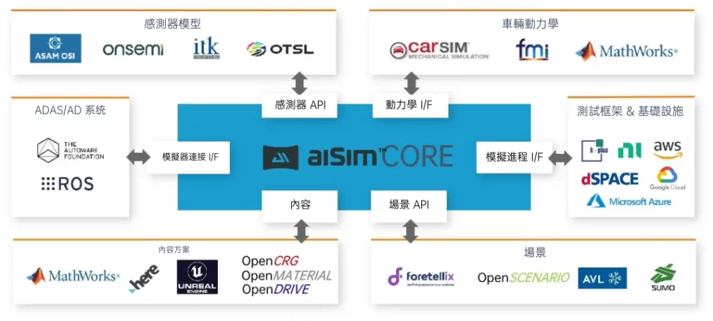 在系統架構上,aiSim 可與 ADAS/自動駕駛系統、中介軟體(如 ROS)、感測器模型與車輛動力學模型進行串接,並透過標準化的感測器 API、動力學 I/F 與場景 API,實現跨模組、跨平台的仿真資料交換。此架構同時支援與第三方測試框架與雲端基礎設施整合,為大規模測試與自動化驗證提供彈性部署能力。