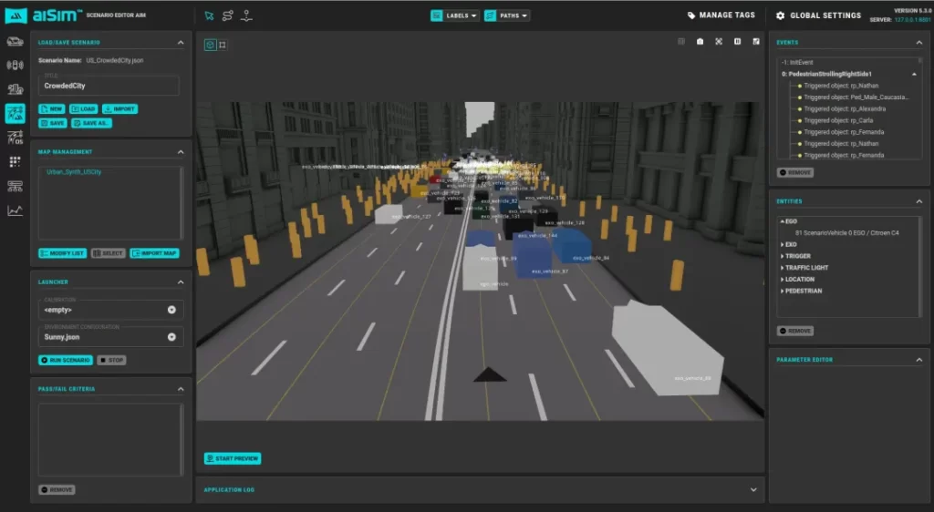 此外,我們導入多種先進的場景建構機制,大幅提升仿真測試在彈性、覆蓋度與可擴充性上的表現。透過互動式圖形化場景編輯工具,支援OpenSCENARIO以及 aiSim 自定義的AimScenario兩種場景格式,可有效縮短場景建模與反覆調整的作業時間。