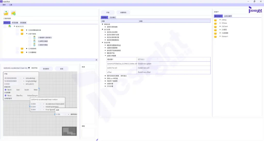 結合自研的 AutoTest 自動化測試與報告平台,使用者可根據既定測試參數與策略快速建立模型、導入自訂案例,並自動生成標準化報告。系統同時支援呼叫國際與國家標準流程(如 RTK、SBAS、RAIM 測試),只需一鍵即可完成場景設定、測試執行與結果輸出,大幅縮短測試時間並提升整體效率。