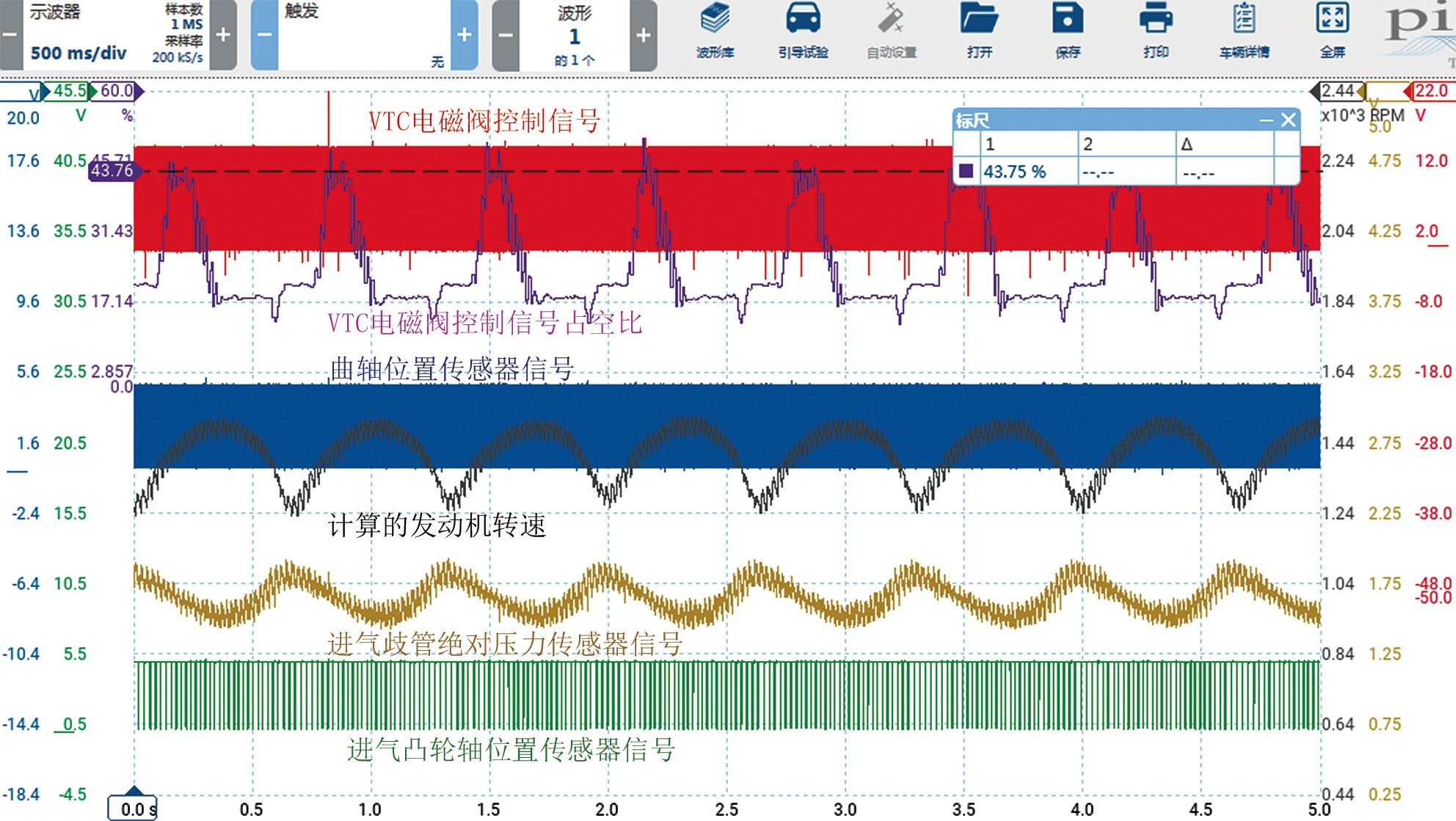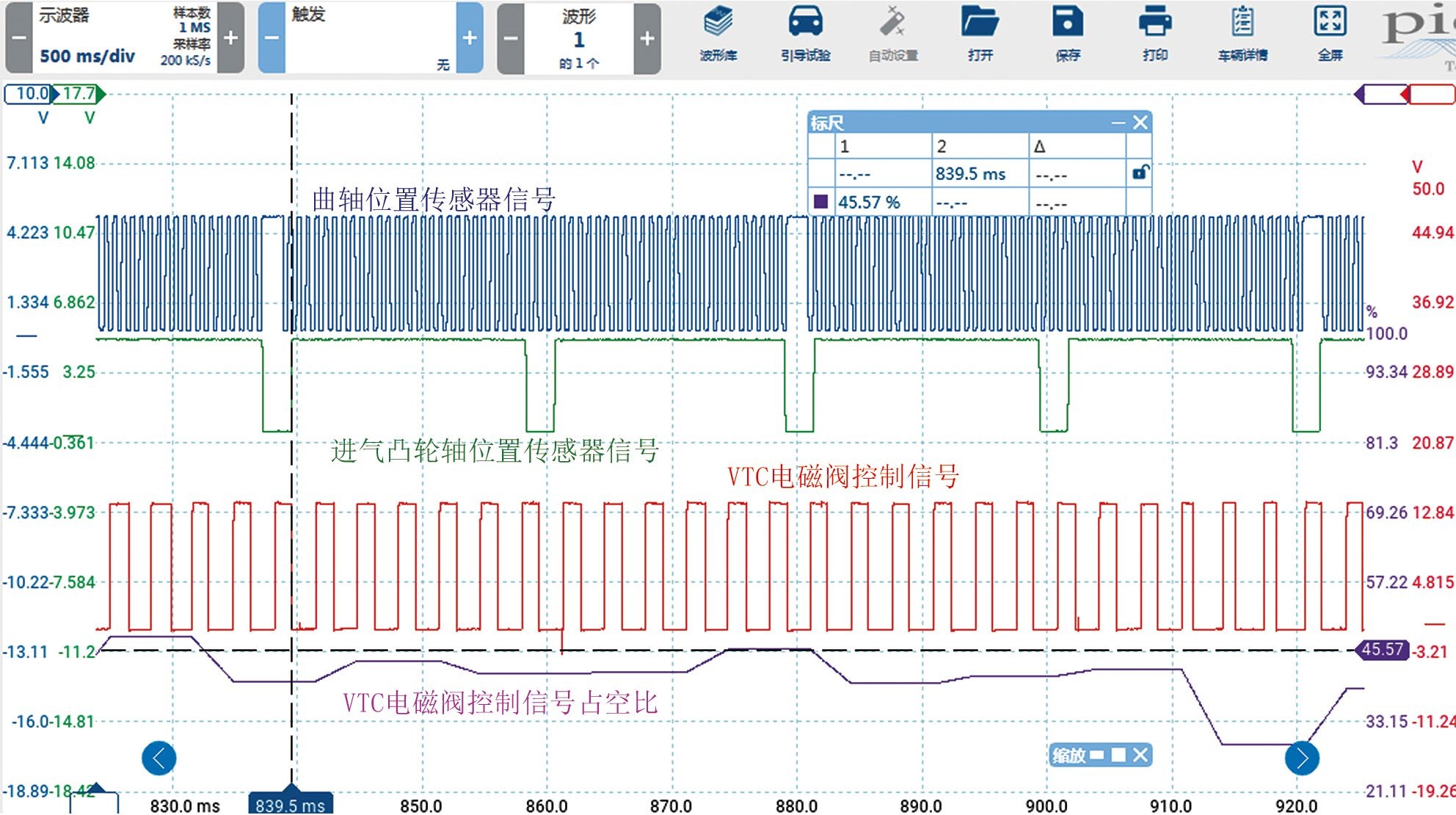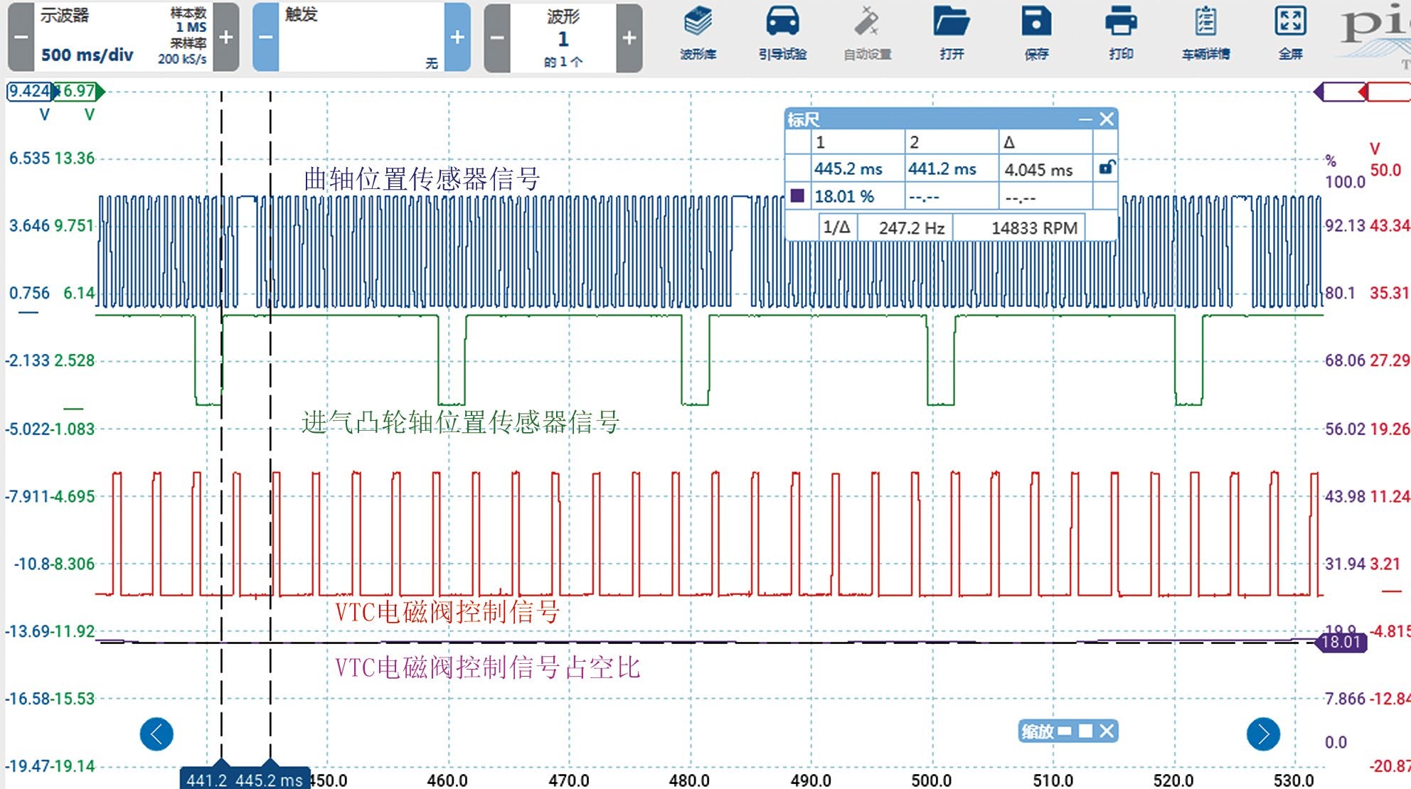圖 6 放大顯示 VTC 電磁閥控制訊號占空比約 45% 時的波形