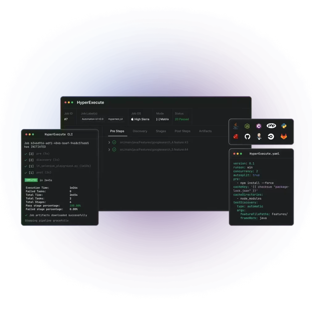 測試可透過 HyperExecute CLI 觸發(查看文件),並使用 YAML 檔案 設定執行參數,包括目標作業系統、並行度及其他 CLI 層級的配置資訊。此 YAML 檔可透過 網頁版 YAML 產生器 輕鬆建立,支援多種程式語言與測試框架(查看文件)。