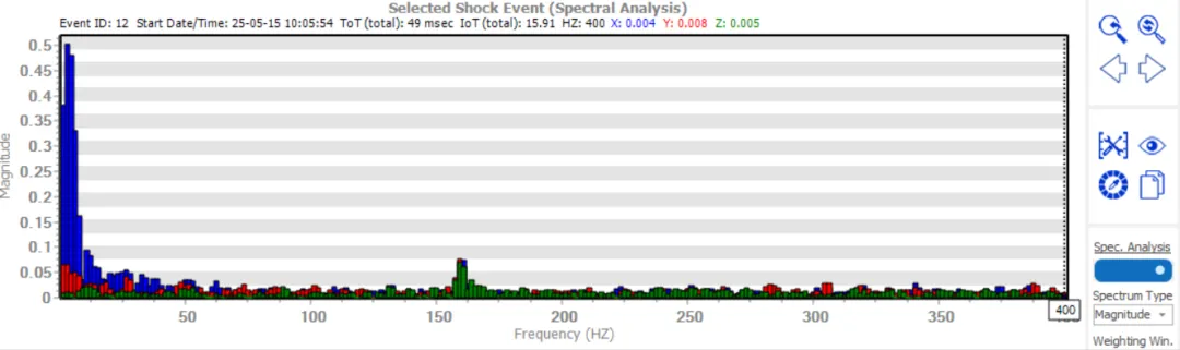 一般衝擊記錄器往往只能在超過閾值的時刻記錄短暫的加速度曲線,採樣點極其有限,難以將時域數據轉化為頻域數據進行分析。而 MSR165 以高頻採樣率(最高 1600Hz)連續採集加速度數據,完整保留了運輸或測試全過程的原始時域訊號。