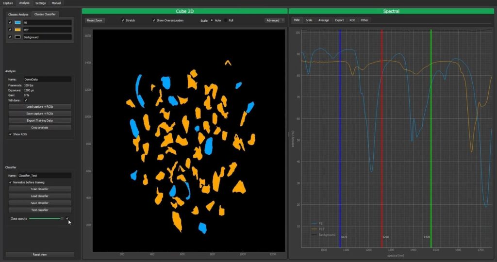 當混合的PE 薄片和PET 薄片通過傳送帶時,高光譜相機會記錄感測器從900nm – 1748nm 的整個波長範圍內材料的光譜特徵。 PE和PET材料的光譜特徵是完全不同的,基於光譜特性我們可以準確地區分PE和PET材料。高光譜軟體可以直接對採集的資料進行處理和分類,從而對傳送帶上移動的塑膠樣品進行直接的顏色分類標註。根據檢測需求,還可以選擇即時處理和分類,這顯示了高光譜成像技術在塑膠分類回收領域的應用潛力。