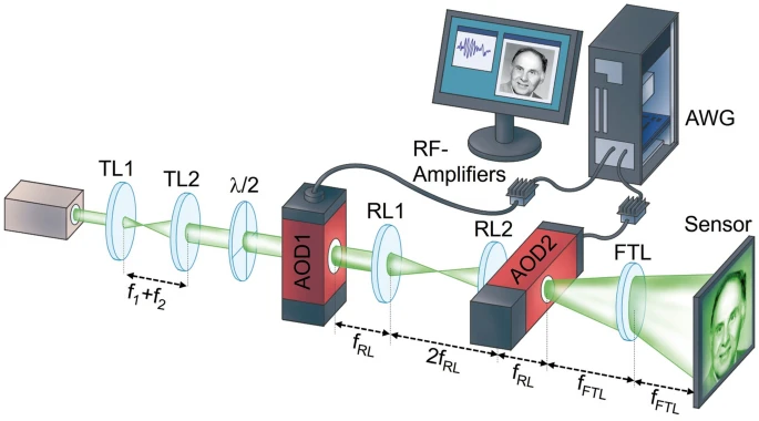 本研究利用高效能任意波形產生器驅動雙聲光偏轉器,實現高速、高品質的全息雷射影像生成,速度提升約 40 倍,顯著改善影像品質。
