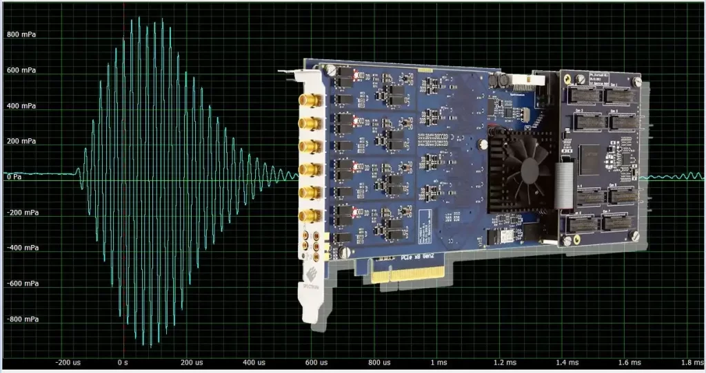 採用德國合作夥伴 Spectrum Instrumentation 的高速、高彈性數位取樣卡,能精準擷取超音波脈衝訊號,有效解決超音波量測中高頻衰減與低訊噪比問題,實現如無損檢測、醫學影像與流體量測等應用中的高動態範圍、高帶寬與多通道同步資料處理。