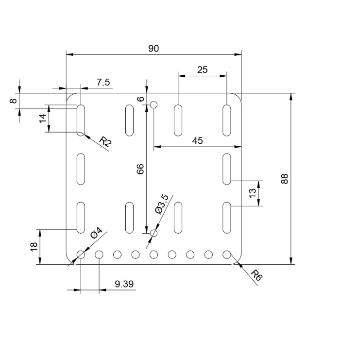一款通用型 DIN 導軌安裝支架,可用於將各類設備或機殼固定於 DIN 導軌上。支架面板設計有多個孔位與長孔,提供多樣化的固定方式,方便不同設備安裝需求。