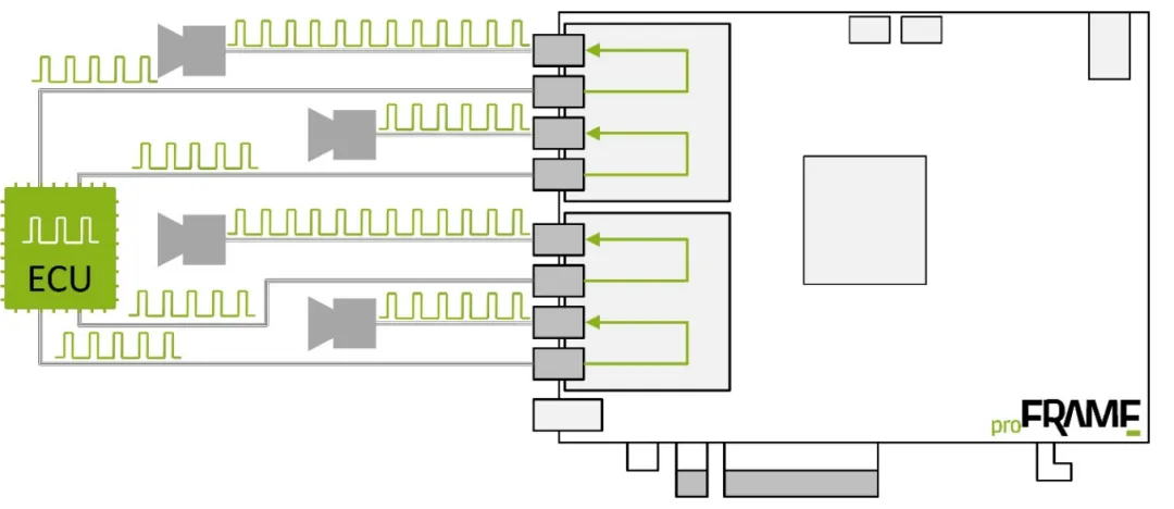 proFRAME 板卡亦支援與其他感測器(如 LiDAR、毫米波雷達、IMU、GNSS 等)進行跨模組時間同步。外部設備傳來的觸發訊號可經由板卡分發至多顆相機,實現跨感測器的統一時間基準,確保異質感知資料在融合時保持高一致性。