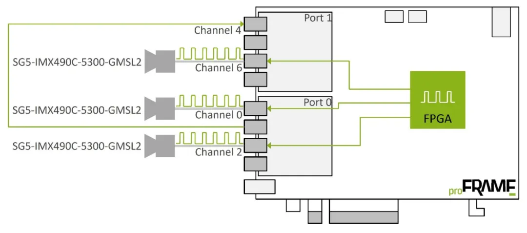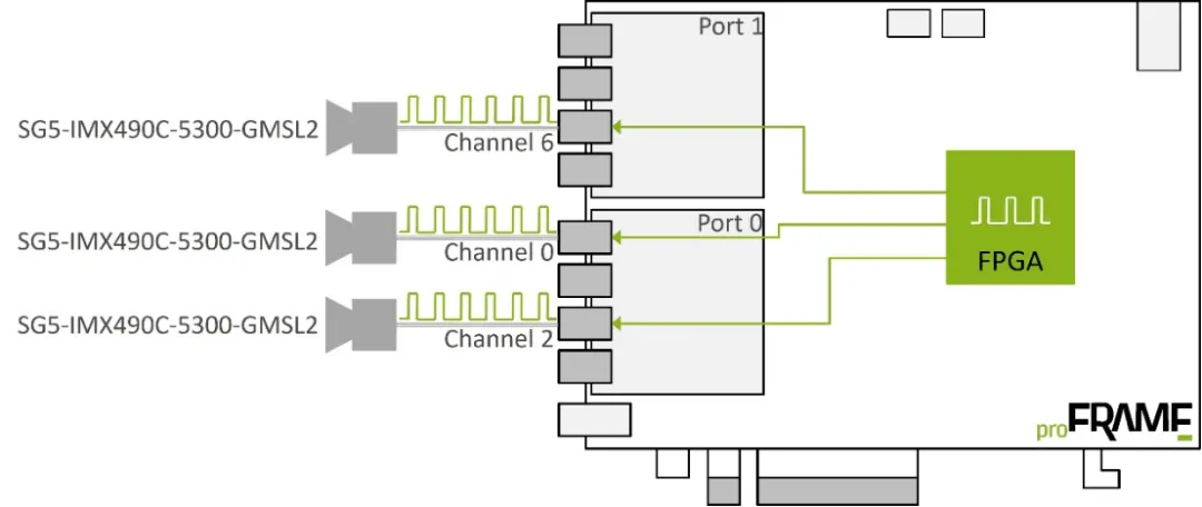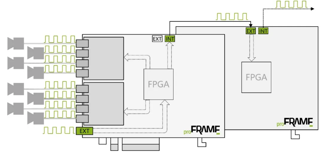 部分相機支援內建脈衝信號(Trigger Pulse)輸出,可作為多相機同步的時脈源。當主相機輸出脈衝信號後,透過同軸電纜傳輸至 proFRAME FPGA,再由 FPGA 分送至其他相機,使所有相機在同一時刻啟動影像擷取,有效降低時間偏差。