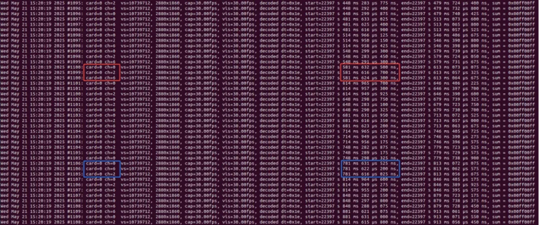 如圖中紅色與藍色框線所示(左側代表擷取通道,右側為當前影像幀的奈秒級時間戳),三台相機之間的時間同步誤差約為 15 微秒(μs),顯示整體同步精度極高,足以滿足多相機感知與影像融合的實驗需求。