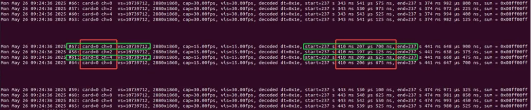 透過 proFRAME 板卡觸發三台相機同步啟動曝光並擷取影像資料,如圖中紅框與藍框所示(左側為擷取通道,右側為影像幀的奈秒級時間戳),三台相機之間的同步誤差約為 15 微秒(μs),與前一項測試結果一致。其中,Channel 4 為 Channel 0 的旁通資料通道,如圖中綠框所示(左側為擷取通道,右側為影像幀的奈秒級時間戳)。旁通影像與原始影像之間的時間誤差約為 2 微秒(μs),顯示 proFRAME 在同步傳輸與旁通擷取中皆能保持高穩定度與極低延遲。
