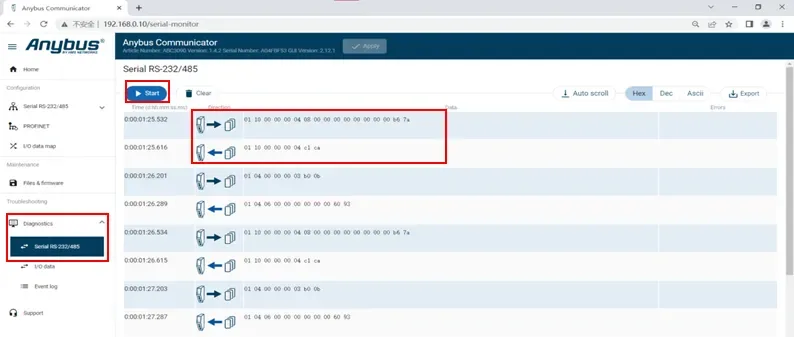 透過通訊閘道的設定介面,工程師可直接在線上即時觀察PLC與串口設備之間實際傳送的資料內容,快速確認通訊流程是否正常。