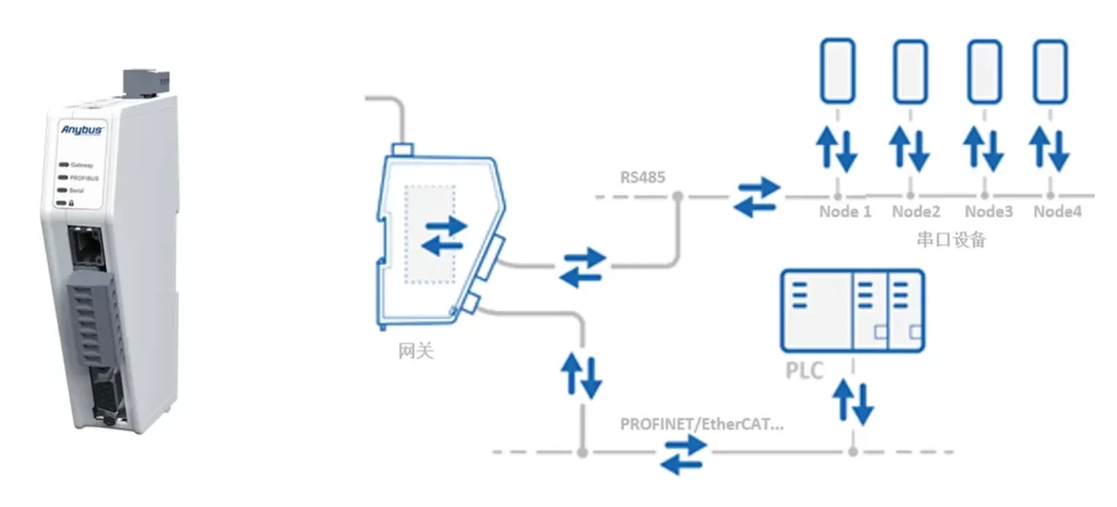此時,透過工業通訊閘道(Protocol Gateway)進行協定轉換,是相對快速且成熟的解決方案。通訊閘道可將串口通訊協定轉換為PROFINET、EtherCAT、EtherNet/IP、Modbus TCP、PROFIBUS DP 等主流工業通訊協定,協助串口設備快速整合至PLC控制系統之中。其通訊架構中,由通訊閘道負責完成「串口通訊資料」與「工業通訊資料」之間的雙向轉換。