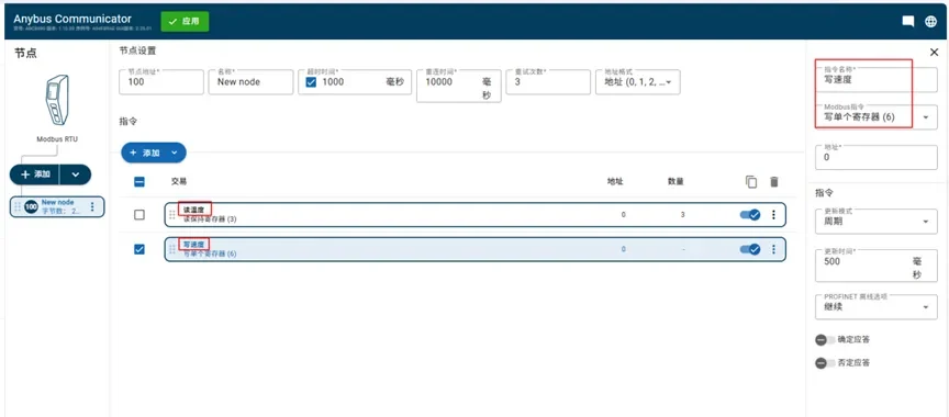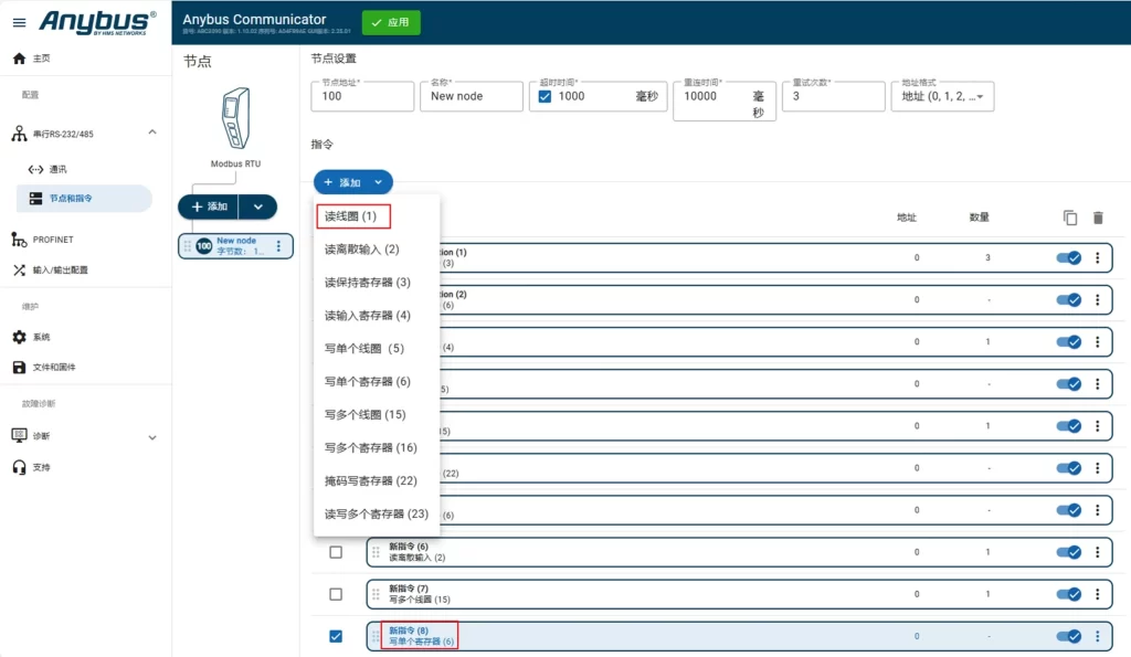 在 Anybus ABC30XX 的 Modbus RTU 設定畫面中,透過「新增節點」功能建立設備通訊節點後,即可設定 Modbus 資料暫存器起始位址與資料長度,完成通訊資料對應設定。