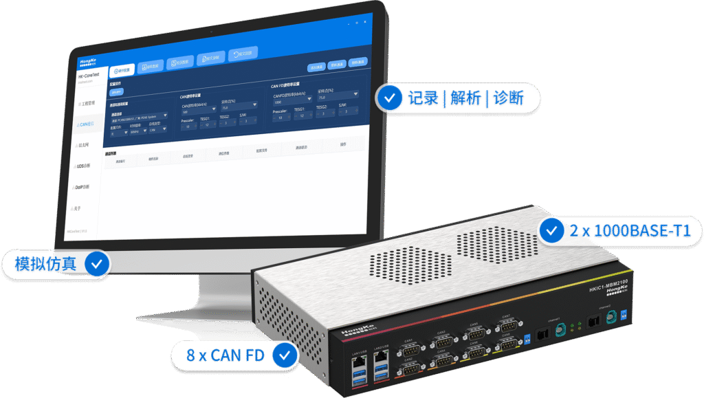 HK-CoreTest 為一套車用電子模擬與測試的整合工具,支援 CAN(含 CAN FD)與車載乙太網等多種車載通訊協定,可進行 DBC 等資料庫解析並支援 UDS 診斷。相容市面多家品牌的工具鏈,可連接、設定與控制所有虹科車載通訊硬體(如虹科網路通訊測試主機板、PCAN-USB/PCIe 系列、車載乙太網工具等),具備車載匯流排監控、模擬與診斷等多項功能。