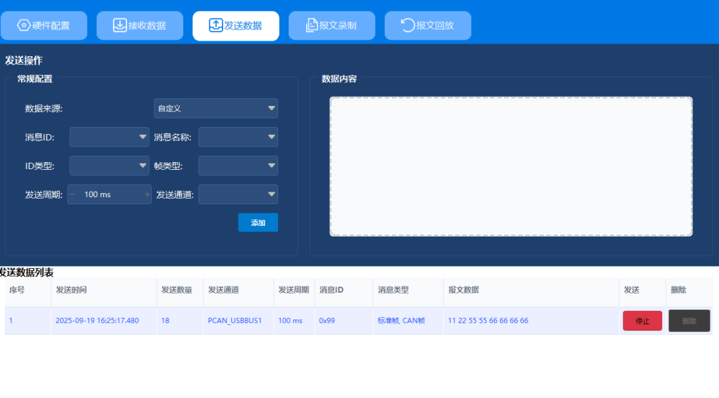 CAN 資料發送:支援 CAN 和 CAN FD 資料傳送,可設定傳送週期、訊息 ID、資料內容等,使用者可模擬 ECU(電子控制單元)向匯流排主動傳送資料