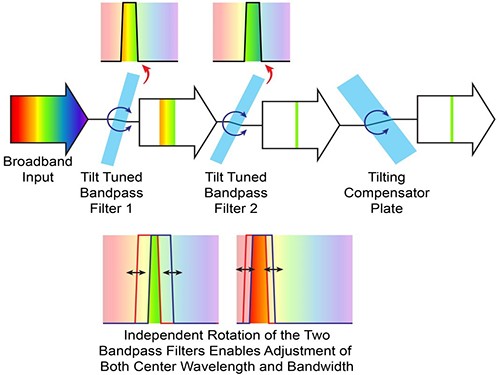 來自任何準直光源的透射光的中心波長和頻寬都完全可調,第三塊玻璃板抵消光束路徑中的任何輕微偏離。